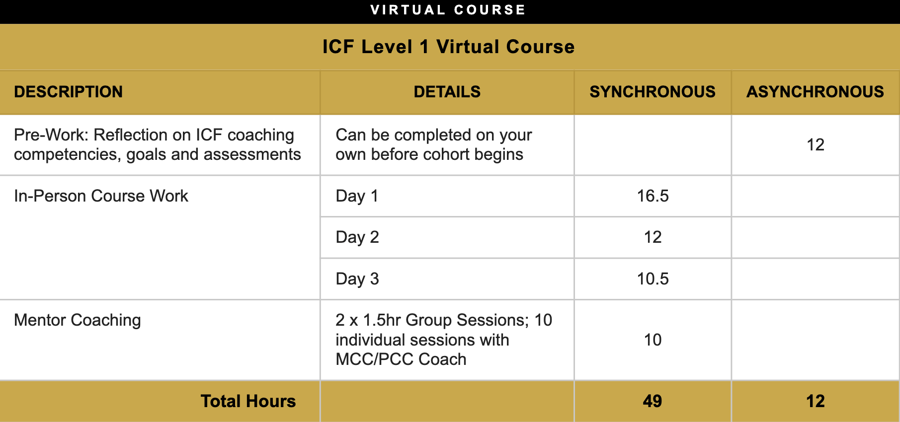 Graduates will receive a Level 1 certificate, which counts toward the 60 coaching education hours required for an ICF Associate Certified Coach (ACC) credential.